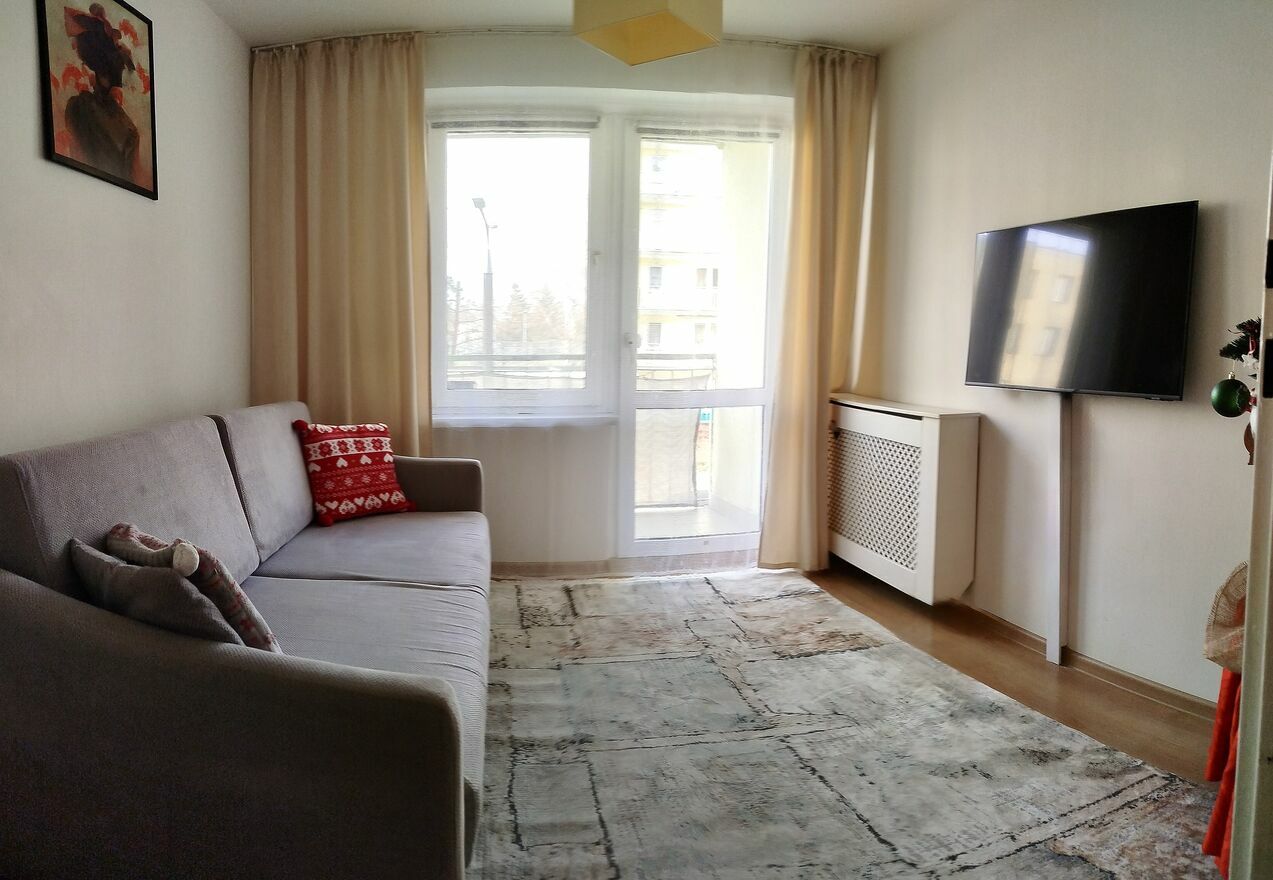 - Jasny salon z wyjściem na balkon typu loggia,