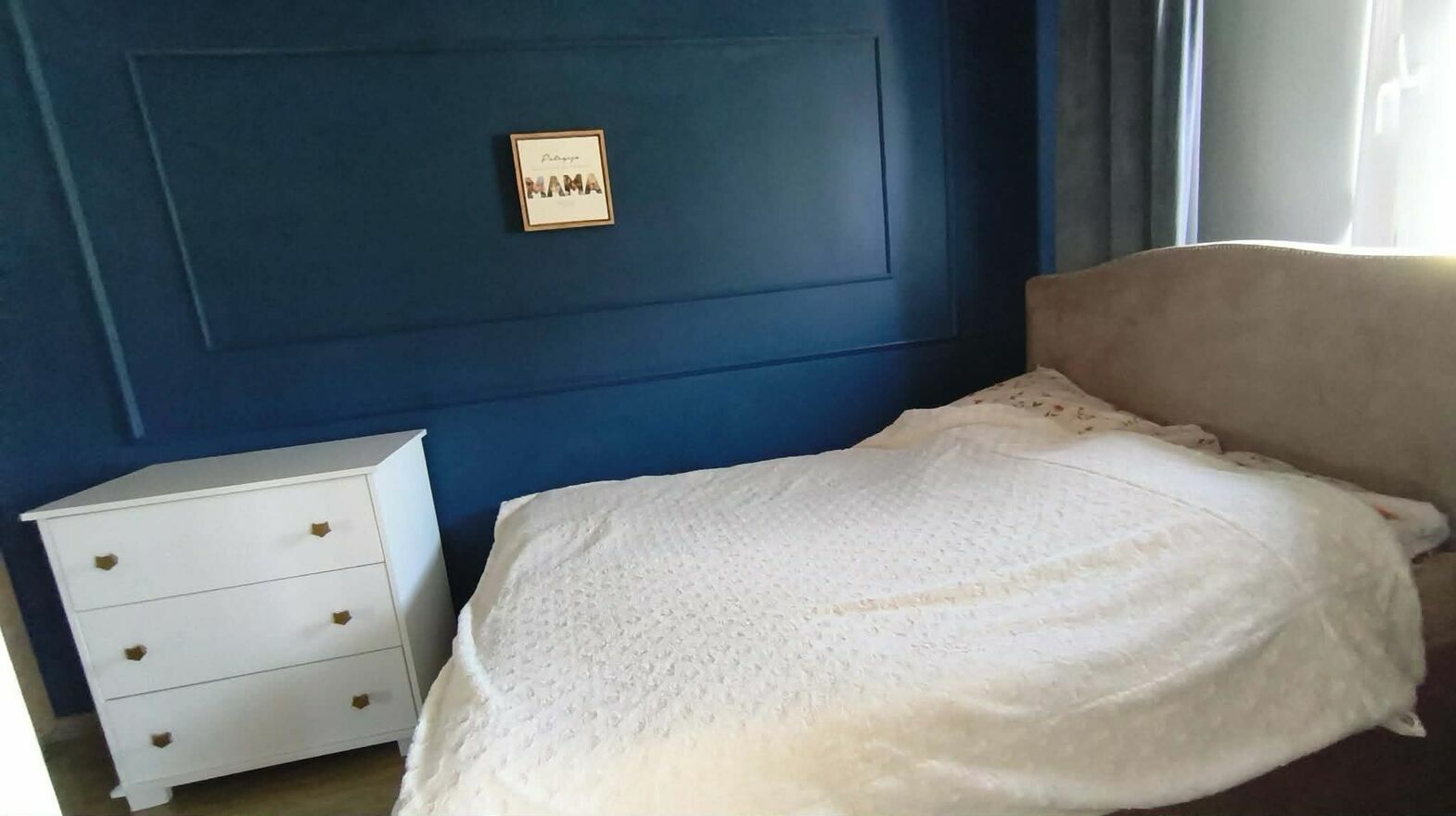 - klimatyczna sypialnia z szafą w zabudowie z lustrem, oraz komodą