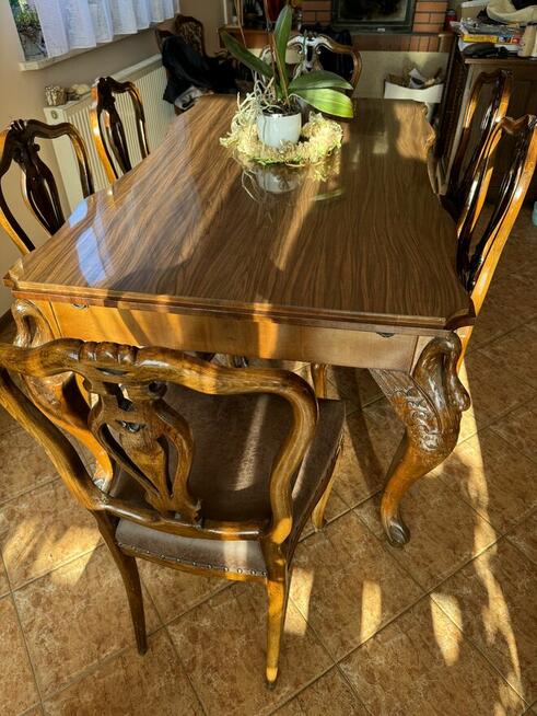 Sprzedam stary rzeźbiony stół o wymiarach 160/120. Każda noga stołu to glowa kaczki. Stół posiada 6 krzeseł, które ...