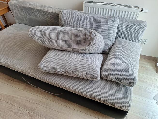 Używana sofa z poduszkami z funkcją spania i schowkiem na podciel. Sofa jest w dobrym stanie gotowa do użytku. Widoczne ...