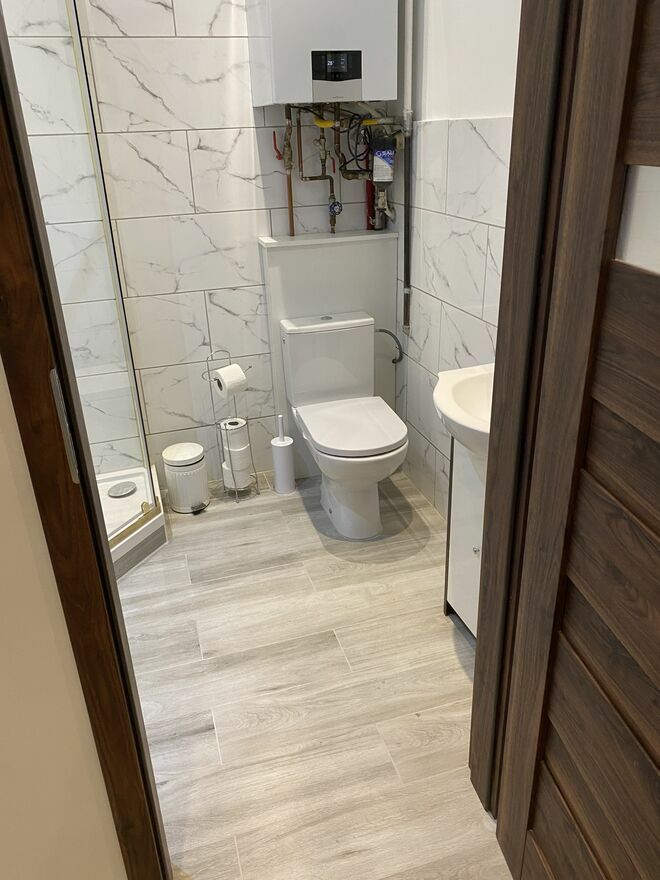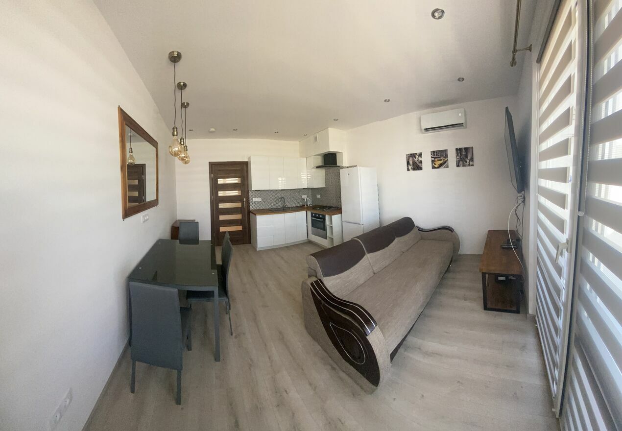 Duży salon z aneksem kuchennym i wyjściem na balkon , sypialnia , łazienka z prysznicem.
