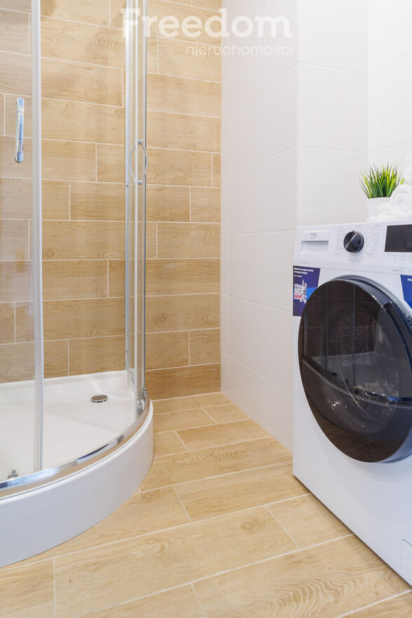 łazience znajdziesz prysznic, duże lustro, grzejnik i pralkę –