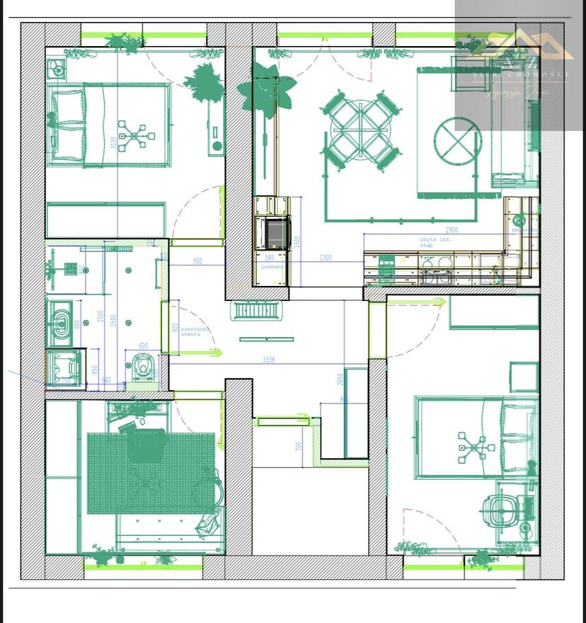 Mieszkanie składa się z: przestronnego salonu z aneksem kuchennym, trzech sypialni, łazienki, funkcjonalnego korytarza oraz dwóch balkonów.