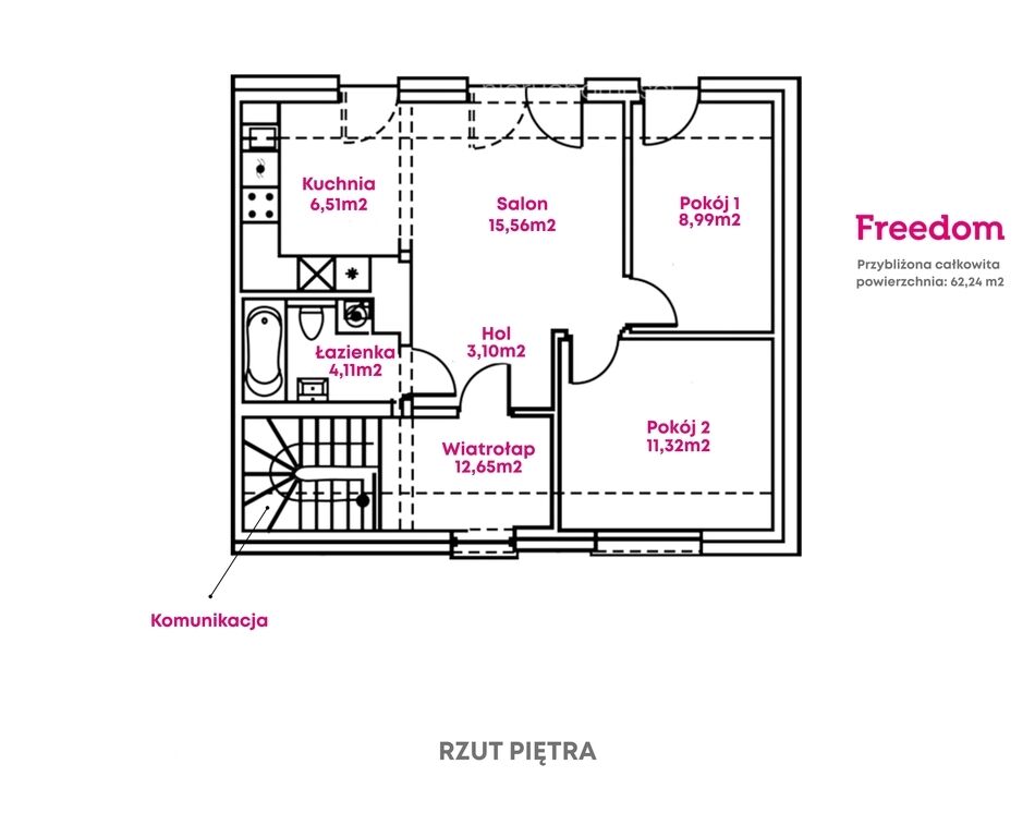 Na piętrze nowo wybudowanego bliźniaka przy ul. Modrzewiowej czekana Ciebie 62,24 m² przemyślanej przestrzeni. Na układ składają