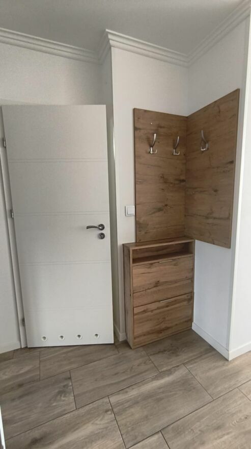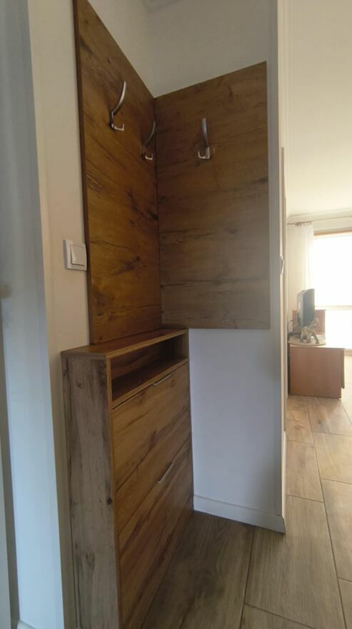 - praktycznego przedpokoju zaopatrzonego w szafką na obuwie, oraz lustro. .