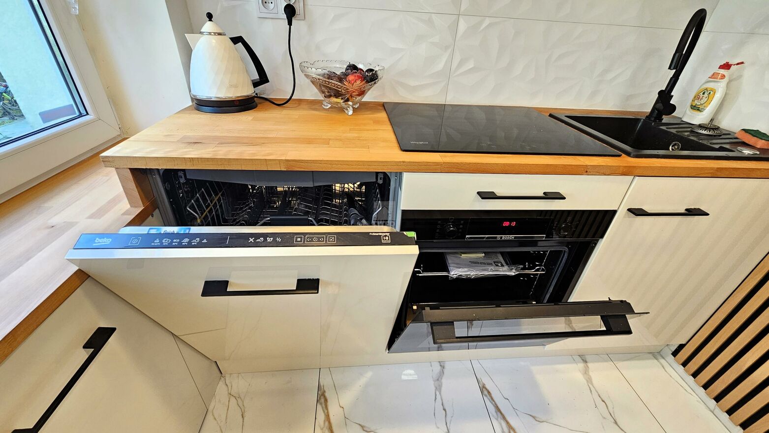 jasna, nowoczesna kuchnia w eleganckich beżach, z drewnianym blatem, stołem oraz nowym sprzętem AGD,