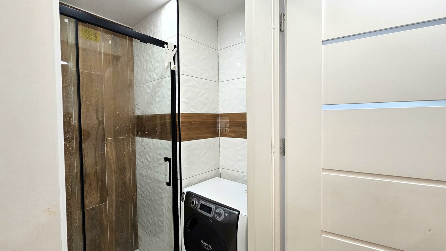 osobna toaleta i łazienka z nowoczesnym prysznicem z odpływem liniowym i pralką.