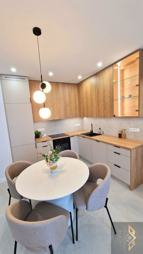 *Kuchnia w zabudowie, wyposażona w nowy sprzęt AGD oraz oświetlenie LED.