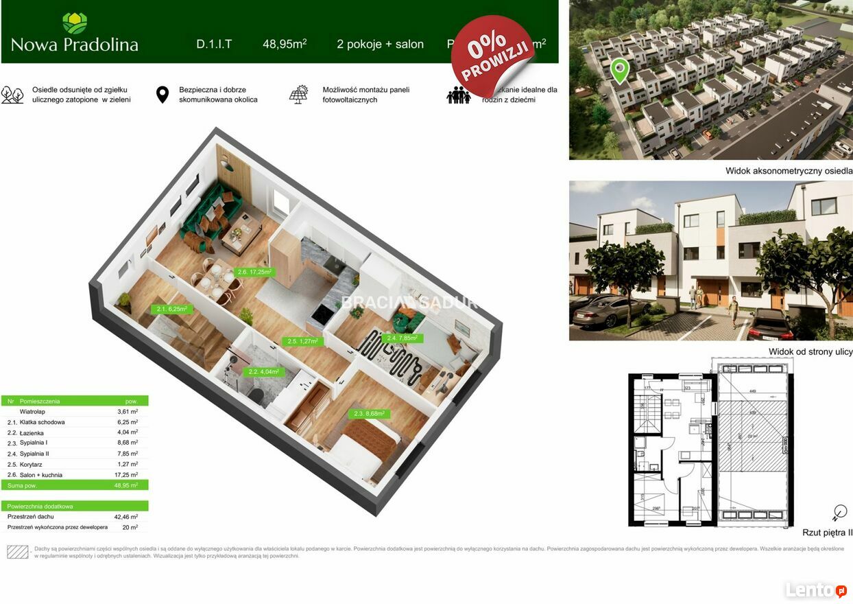 Prezentowane mieszkanie to przestronne, 3 pokojowe mieszkanie na 2 piętrze o pow. 48,95 m 2 . Składa się z salonu z aneksem kuchennym pow. 17,25 m 2 , 2 sypialni o pow. 8,68 m 2 i 7,85 m 2 , łazienki (4,04 m 2 ) oraz wiatrołapu i przedpokoju. Do mieszkania przynależy przestrzeń dachu o pow. 42,46 m 2,