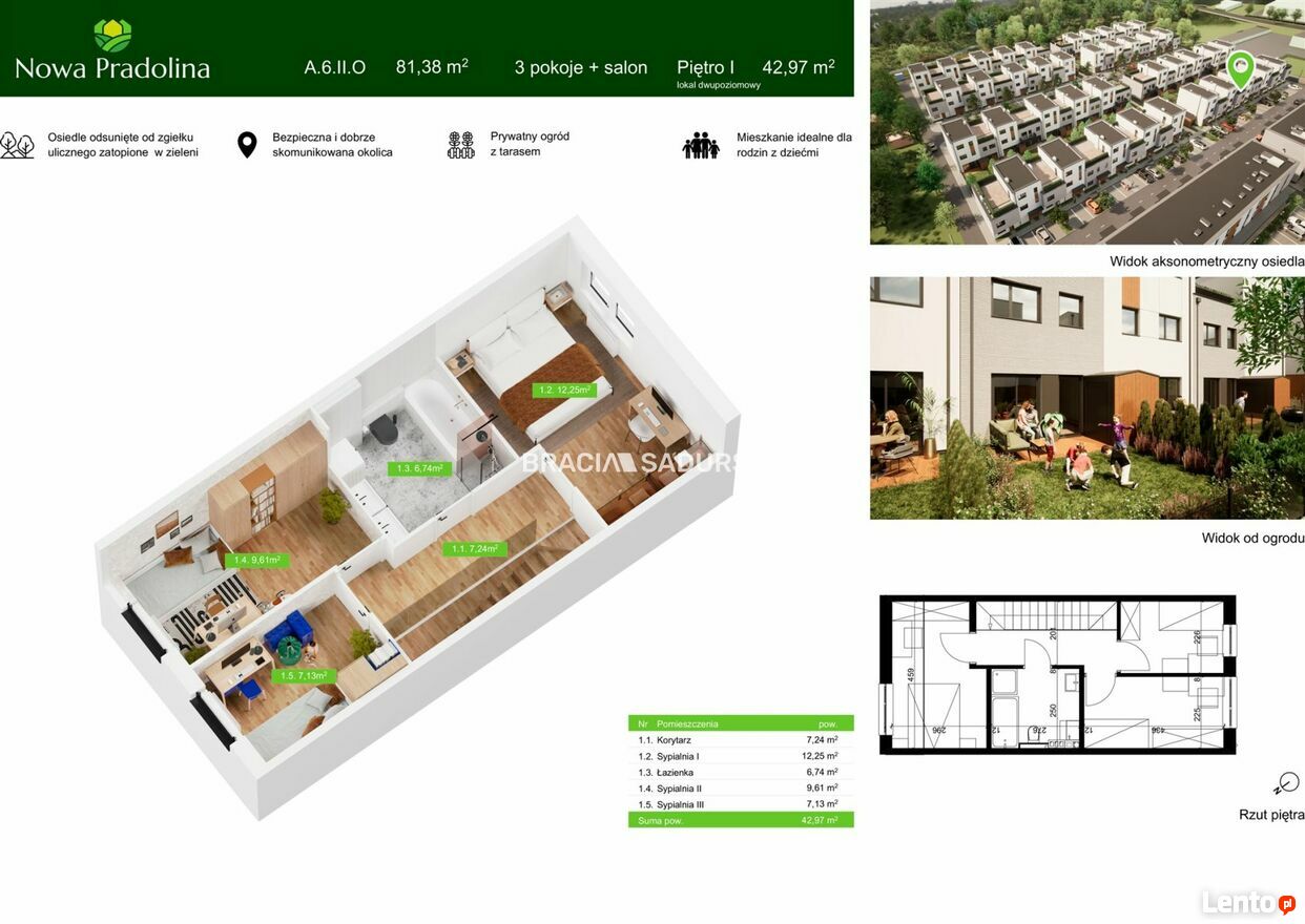 Prezentowane mieszkanie to przestronne, 2 poziomowe, 4 pokojowe mieszkanie na parterze i 1 piętrze o pow. 81,38 m 2 z ogródkiem o pow. 32,30 m 2 .