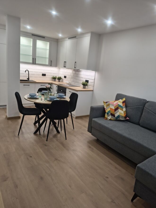 Mieszkanie jest jasne, ciepłe i przytulne, idealne zarówno dla pary, jak i singla.