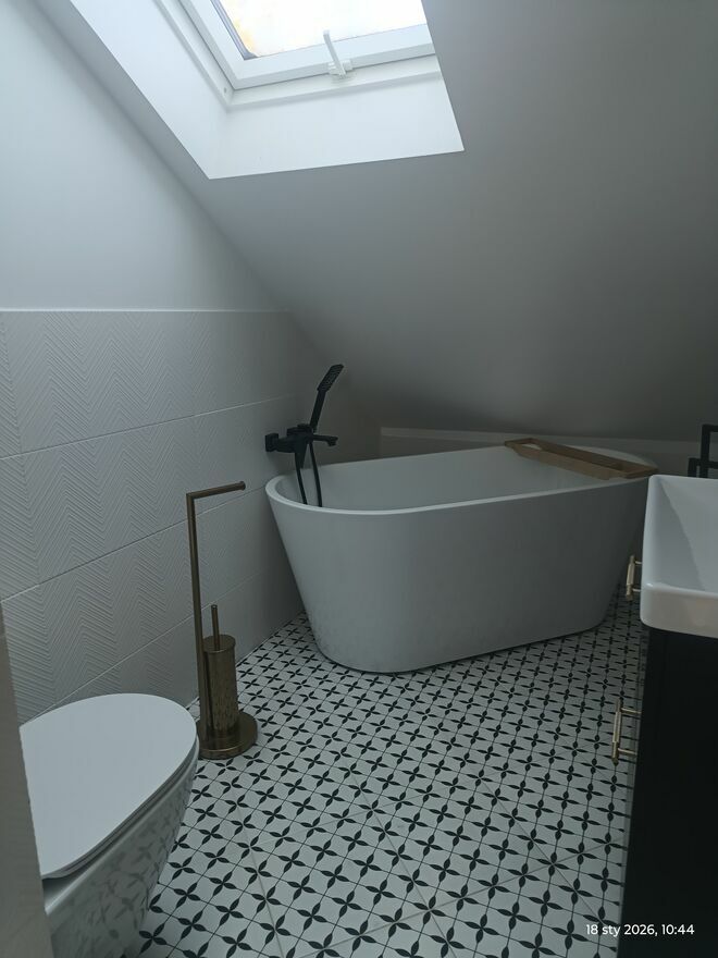 Łazienki, płytki glazura terakota, biały montaż