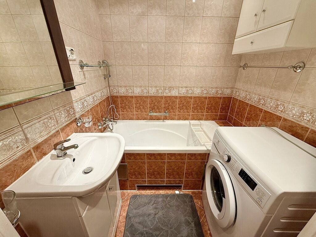 Łazienka: wanna, umywalka z szafką, pralka, szafka wisząca