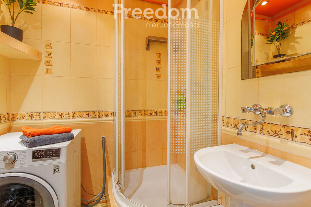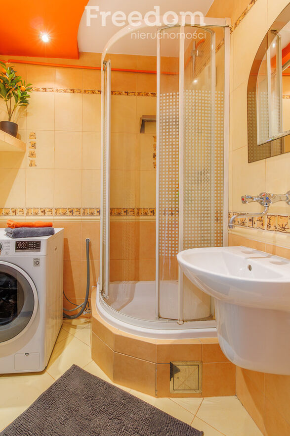 łazience znajdziemy prysznic, umywalkę oraz pralkę, a osobna